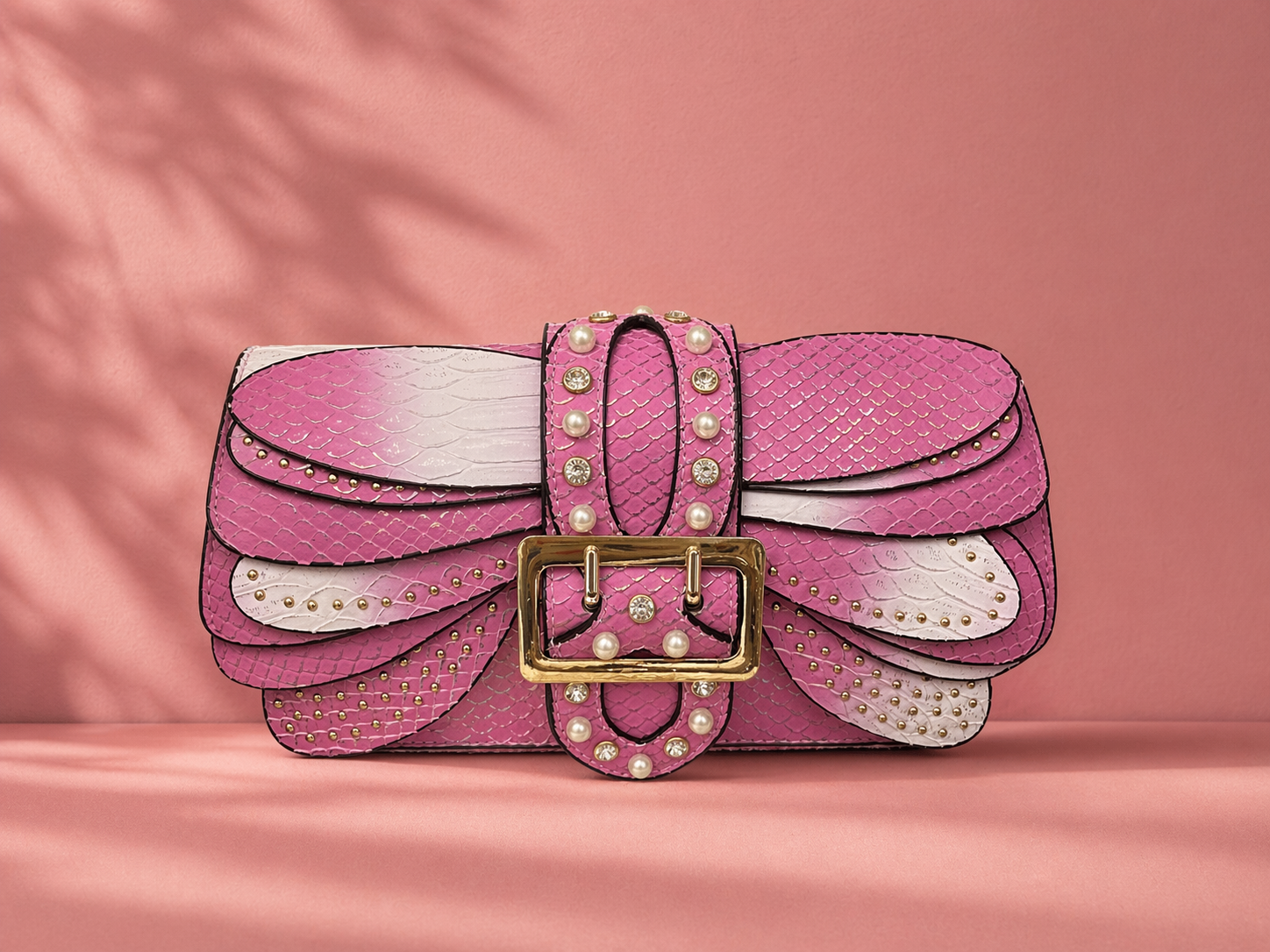 Transform your evening look with this breathtaking butterfly-inspired statement clutch. Featuring unique, hand-layered "wing" panels in a vibrant pink-and-white ombre snakeskin texture, this bag is a true conversation piece. The center strap is opulently adorned with faux pearls and shimmering crystals, finished with a bold gold-tone statement buckle. Whether you're attending a gala, a spring wedding, or a high-fashion event, this whimsical yet sophisticated purse adds a regal, feminine touch to any outfit.