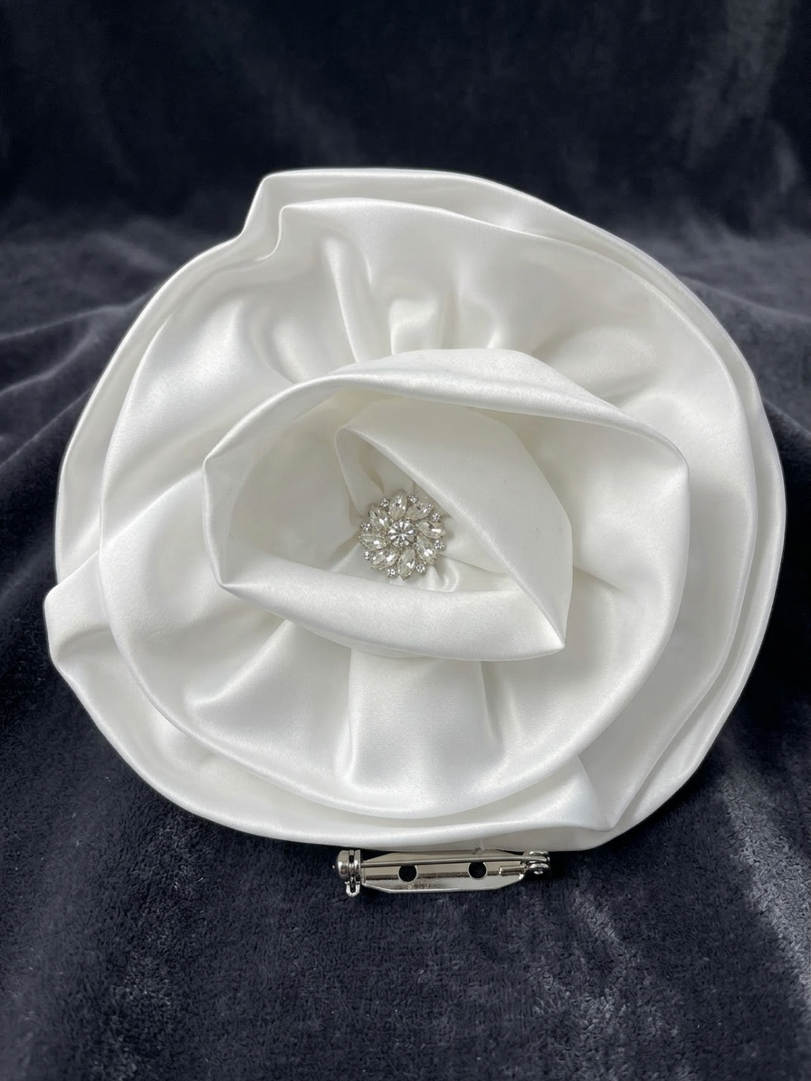 Add a touch of timeless romance to your special day with this exquisite bridal white satin flower brooch. Featuring smooth, lustrous satin petals folded into a classic rose silhouette, this oversized pin is anchored by a brilliant clear crystal sunburst at its heart. Perfect for brides, bridesmaids, or formal evening wear, this elegant accessory looks stunning on a wedding sash, a tailored ivory blazer, or as a sophisticated hair piece. A must-have for weddings, baptisms, or any white-tie event.